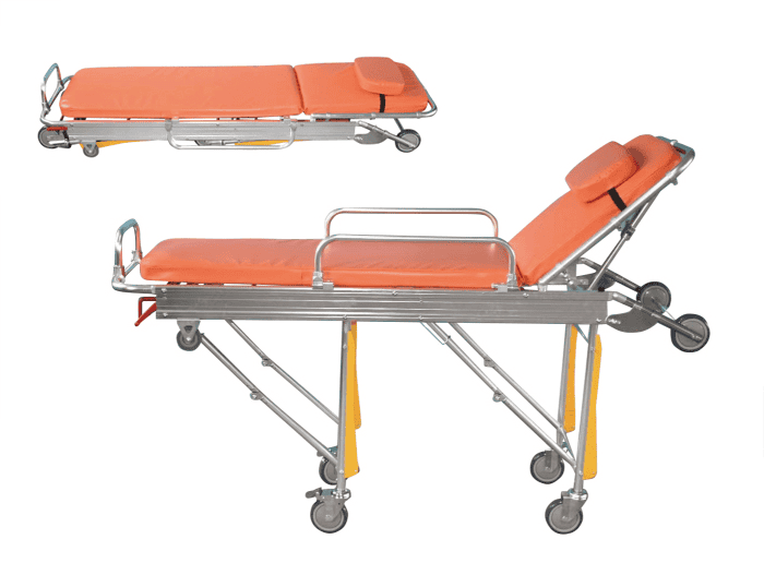 Automatic Loading Mechanism: Features a specialized folding leg system with a red release handle, allowing the stretcher to be easily loaded into and unloaded from an ambulance by a single operator.