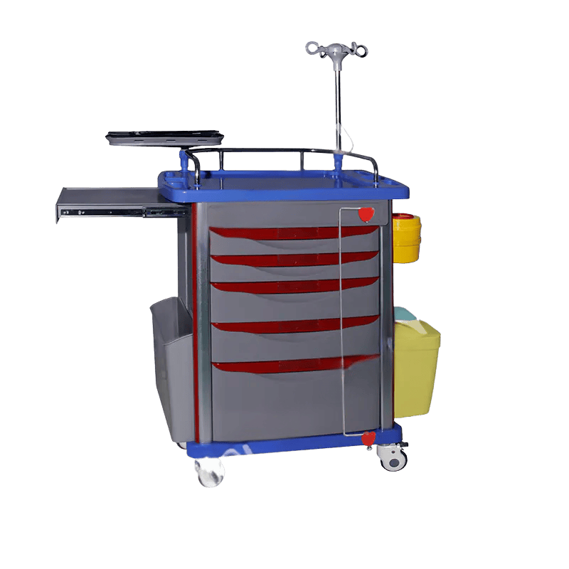 The LSET-85011AB ABS Plastic Emergency Trolley is a high-performance, multi-functional medical crash cart designed for rapid response and systematic organization of life-saving equipment in emergency departments and intensive care units.